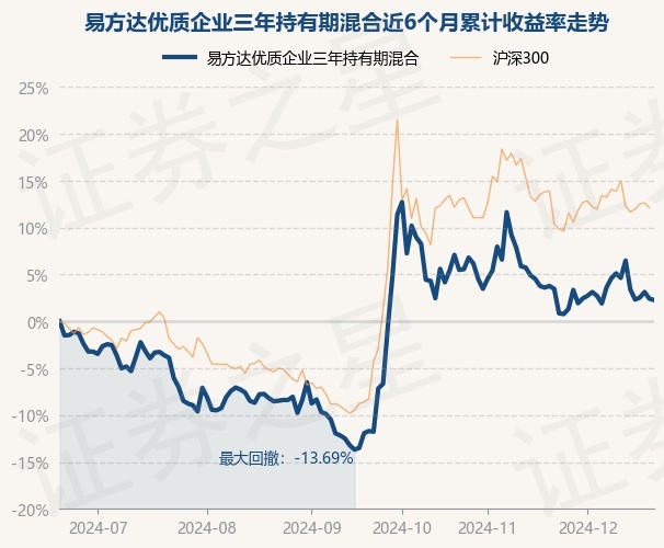 证券之星消息,12月20日,易方达优质企业三年持有期混合最新单位净值为0.8704元,累计净值为0.8704元,较前一交易日下跌0.14%。历史数据显示该基金近1个月下跌1.45%,近3个月上涨15.82%,近6个月上涨2.27%,近1年上涨7.27%。该基金近6个月的累计收益率走势如下图: