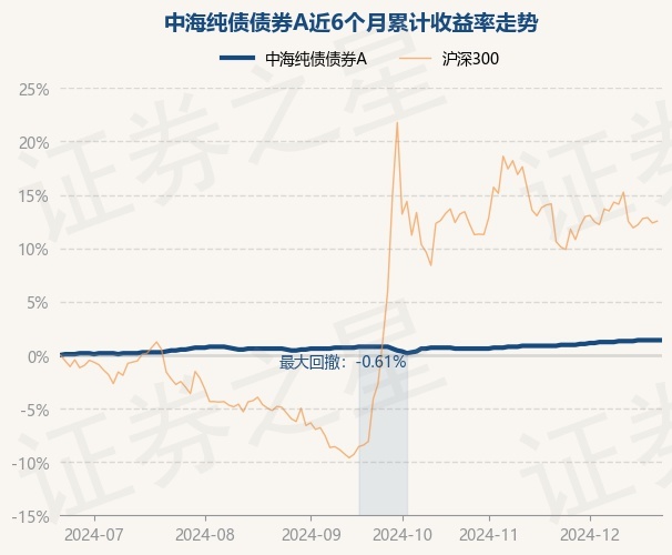 证券之星消息,12月23日,中海纯债债券A最新单位净值为1.151元,累计净值为1.378元,较前一交易日上涨0.0%。历史数据显示该基金近1个月上涨0.44%,近3个月上涨0.61%,近6个月上涨1.4%,近1年上涨4.21%。该基金近6个月的累计收益率走势如下图: