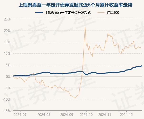 证券之星消息,12月23日,上银聚嘉益一年定开债券发起式最新单位净值为1.0599元,累计净值为1.0977元,较前一交易日上涨0.08%。历史数据显示该基金近1个月上涨2.6%,近3个月上涨2.51%,近6个月上涨4.46%,近1年上涨7.58%。该基金近6个月的累计收益率走势如下图: