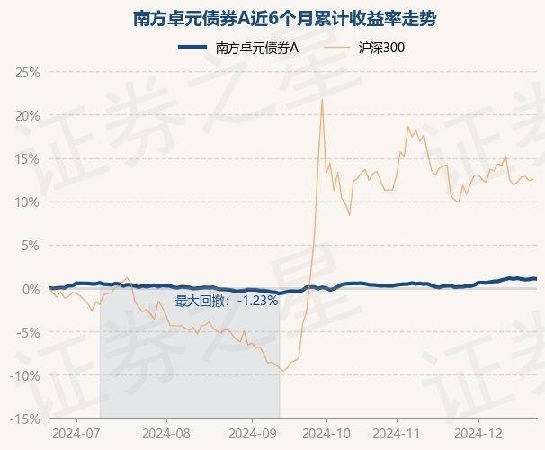 证券之星消息,12月23日,南方卓元债券A最新单位净值为1.0823元,累计净值为1.3597元,较前一交易日下跌0.05%。历史数据显示该基金近1个月上涨0.97%,近3个月上涨1.31%,近6个月上涨1.05%,近1年上涨4.77%。该基金近6个月的累计收益率走势如下图: