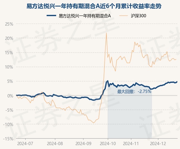 证券之星消息,12月23日,易方达悦兴一年持有期混合A最新单位净值为1.0378元,累计净值为1.0378元,较前一交易日上涨0.3%。历史数据显示该基金近1个月上涨2.48%,近3个月上涨6.05%,近6个月上涨4.76%,近1年上涨8.42%。该基金近6个月的累计收益率走势如下图: