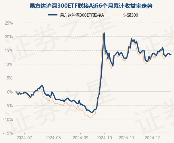 证券之星消息,12月23日,易方达沪深300ETF联接A最新单位净值为1.5518元,累计净值为1.5518元,较前一交易日上涨0.14%。历史数据显示该基金近1个月上涨1.77%,近3个月上涨21.01%,近6个月上涨13.53%,近1年上涨19.44%。该基金近6个月的累计收益率走势如下图: