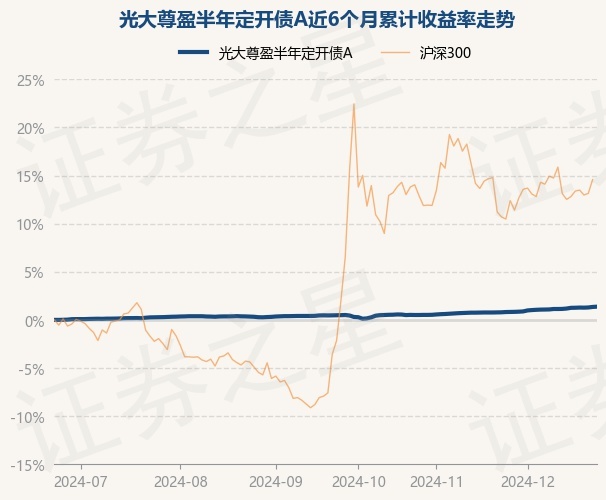 证券之星消息,12月24日,光大尊盈半年定开债A最新单位净值为1.0914元,累计净值为1.2643元,较前一交易日上涨0.03%。历史数据显示该基金近1个月上涨0.58%,近3个月上涨0.89%,近6个月上涨1.37%,近1年上涨3.38%。该基金近6个月的累计收益率走势如下图: