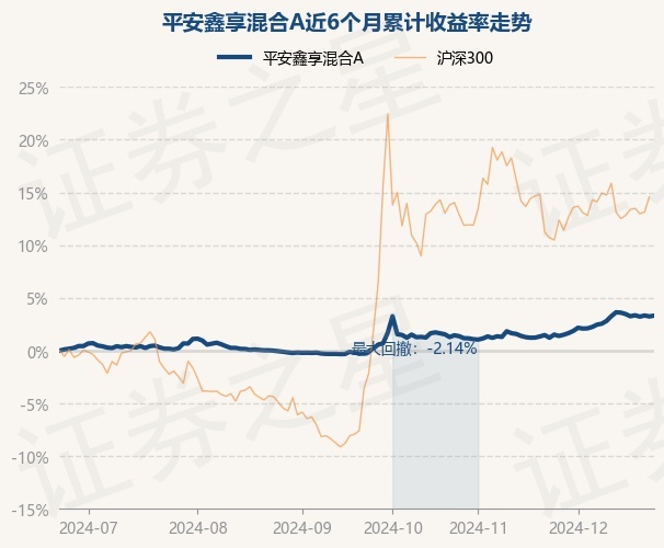 证券之星消息,12月24日,平安鑫享混合A最新单位净值为1.6068元,累计净值为1.6068元,较前一交易日上涨0.07%。历史数据显示该基金近1个月上涨2.07%,近3个月上涨3.35%,近6个月上涨3.32%,近1年上涨7.18%。该基金近6个月的累计收益率走势如下图: