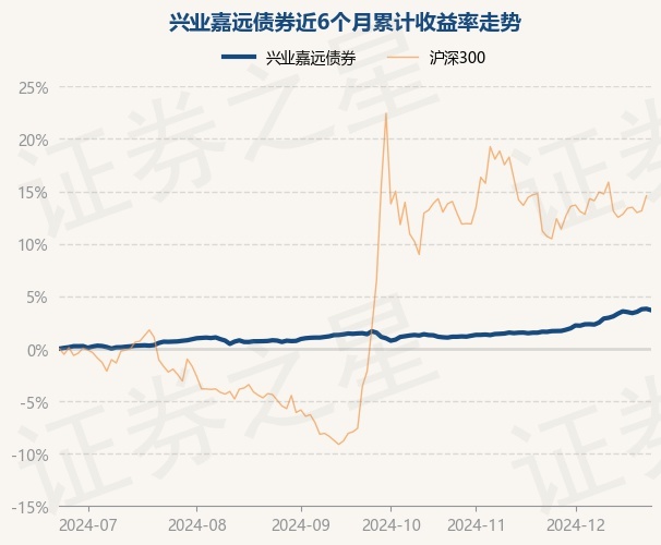 证券之星消息,12月24日,兴业嘉远债券最新单位净值为1.0385元,累计净值为1.0725元,较前一交易日下跌0.13%。历史数据显示该基金近1个月上涨2.03%,近3个月上涨2.25%,近6个月上涨3.67%,近1年上涨6.71%。该基金近6个月的累计收益率走势如下图: