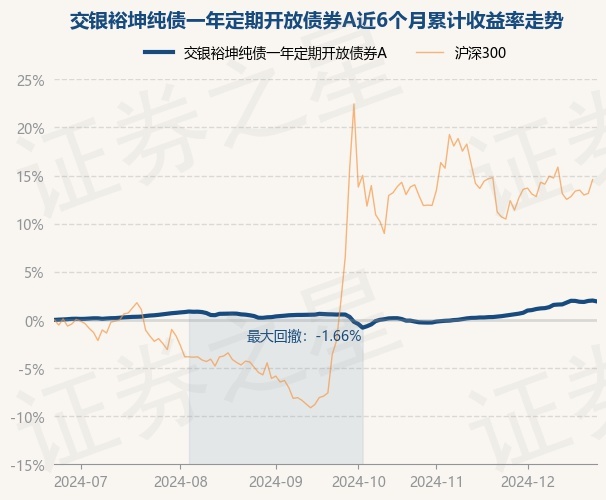 证券之星消息,12月24日,交银裕坤纯债一年定期开放债券A最新单位净值为1.0995元,累计净值为1.1745元,较前一交易日下跌0.09%。历史数据显示该基金近1个月上涨2.54%,近3个月上涨2.37%,近6个月上涨2.94%,近1年上涨5.85%。该基金近6个月的累计收益率走势如下图: