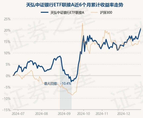 证券之星消息,12月25日,天弘中证银行ETF联接A最新单位净值为1.6222元,累计净值为1.6222元,较前一交易日上涨1.05%。历史数据显示该基金近1个月上涨8.4%,近3个月上涨12.98%,近6个月上涨20.67%,近1年上涨41.91%。该基金近6个月的累计收益率走势如下图: