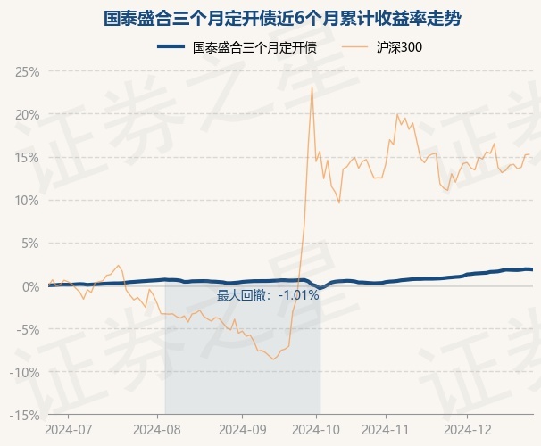 证券之星消息,12月25日,国泰盛合三个月定开债最新单位净值为1.1307元,累计净值为1.1806元,较前一交易日下跌0.04%。历史数据显示该基金近1个月上涨0.94%,近3个月上涨1.21%,近6个月上涨1.84%,近1年上涨4.64%。该基金近6个月的累计收益率走势如下图: