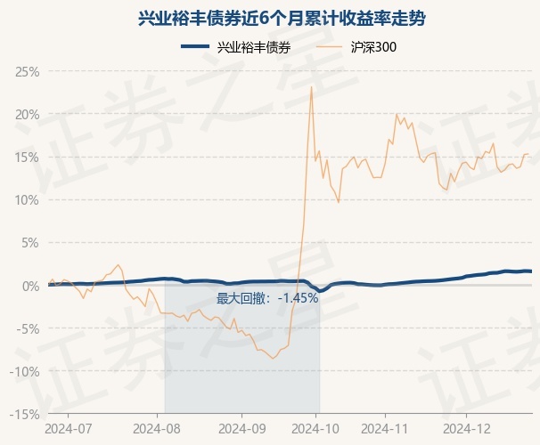 证券之星消息,12月25日,兴业裕丰债券最新单位净值为1.0809元,累计净值为1.3159元,较前一交易日下跌0.03%。历史数据显示该基金近1个月上涨0.96%,近3个月上涨1.12%,近6个月上涨1.56%,近1年上涨4.79%。该基金近6个月的累计收益率走势如下图: