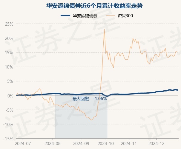 证券之星消息,12月25日,华安添锦债券最新单位净值为1.0532元,累计净值为1.0712元,较前一交易日下跌0.05%。历史数据显示该基金近1个月上涨0.92%,近3个月上涨1.18%,近6个月上涨1.82%,近1年上涨4.63%。该基金近6个月的累计收益率走势如下图: