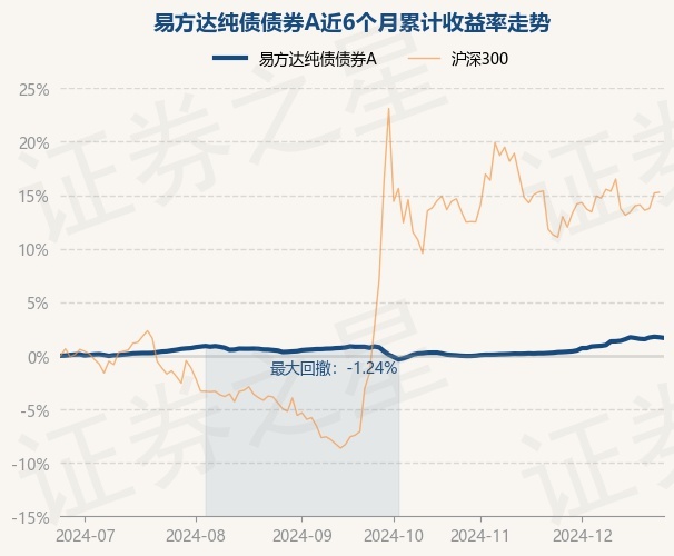证券之星消息,12月25日,易方达纯债债券A最新单位净值为1.1201元,累计净值为1.5991元,较前一交易日下跌0.06%。历史数据显示该基金近1个月上涨1.33%,近3个月上涨0.8%,近6个月上涨1.67%,近1年上涨5.24%。该基金近6个月的累计收益率走势如下图: