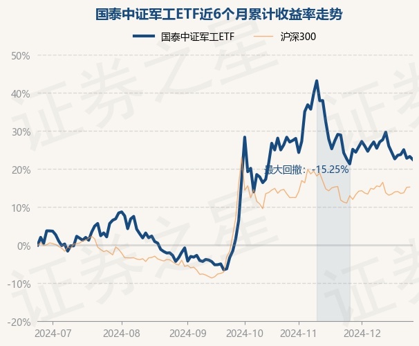 证券之星消息,12月25日,国泰中证军工ETF最新单位净值为1.0384元,累计净值为1.0384元,较前一交易日下跌0.64%。历史数据显示该基金近1个月下跌0.11%,近3个月上涨24.45%,近6个月上涨22.51%,近1年上涨9.59%。该基金近6个月的累计收益率走势如下图: