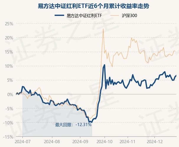 证券之星消息,12月25日,易方达中证红利ETF最新单位净值为1.373元,累计净值为1.644元,较前一交易日上涨0.39%。历史数据显示该基金近1个月上涨4.25%,近3个月上涨8.99%,近6个月上涨6.5%,近1年上涨17.91%。该基金近6个月的累计收益率走势如下图: