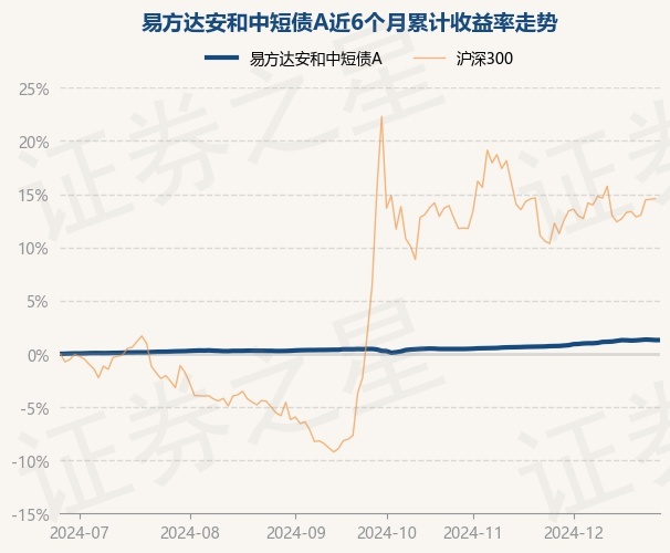 证券之星消息,12月26日,易方达安和中短债A最新单位净值为1.0766元,累计净值为1.1266元,较前一交易日上涨0.0%。历史数据显示该基金近1个月上涨0.56%,近3个月上涨0.83%,近6个月上涨1.29%,近1年上涨3.17%。该基金近6个月的累计收益率走势如下图: