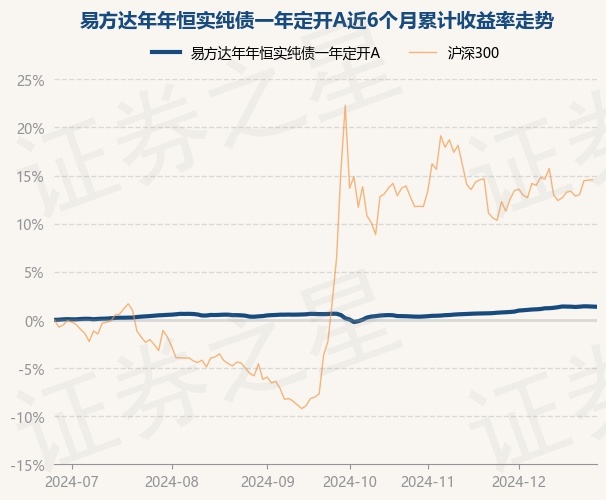 证券之星消息,12月26日,易方达年年恒实纯债一年定开A最新单位净值为1.0316元,累计净值为1.1598元,较前一交易日下跌0.02%。历史数据显示该基金近1个月上涨0.59%,近3个月上涨0.72%,近6个月上涨1.36%,近1年上涨4.43%。该基金近6个月的累计收益率走势如下图: