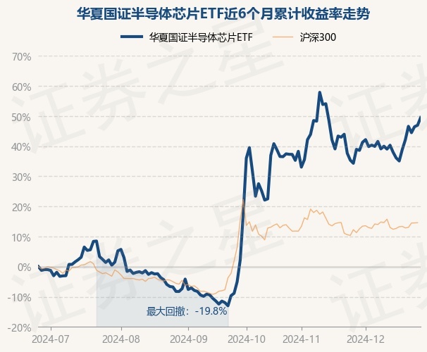 证券之星消息,12月26日,华夏国证半导体芯片ETF最新单位净值为1.2825元,累计净值为1.2825元,较前一交易日上涨1.74%。历史数据显示该基金近1个月上涨11.3%,近3个月上涨57.4%,近6个月上涨49.49%,近1年上涨42.77%。该基金近6个月的累计收益率走势如下图: