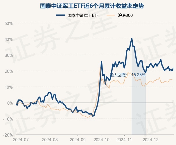 证券之星消息,12月26日,国泰中证军工ETF最新单位净值为1.0523元,累计净值为1.0523元,较前一交易日上涨1.34%。历史数据显示该基金近1个月上涨2.3%,近3个月上涨22.15%,近6个月上涨21.65%,近1年上涨12.37%。该基金近6个月的累计收益率走势如下图: