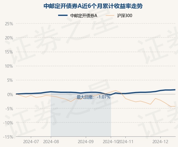 证券之星消息,12月27日,中邮定开债券A最新单位净值为1.134元,累计净值为1.633元,较前一交易日上涨0.09%。历史数据显示该基金近1个月上涨0.8%,近3个月上涨1.07%,近6个月上涨1.52%,近1年上涨4.9%。该基金近6个月的累计收益率走势如下图: