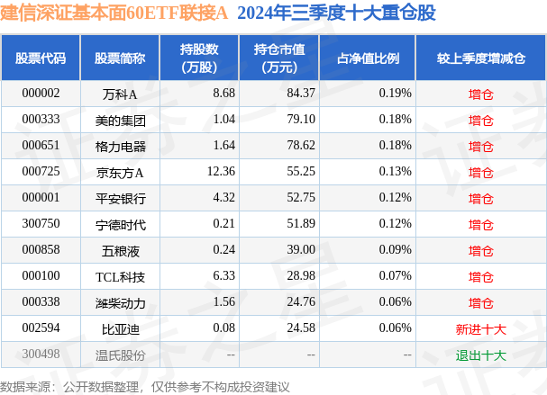 建信深证基本面60ETF联接A为指数型-股票基金,根据最新一期基金季报显示,该基金资产配置:股票占净值比2.31%,无债券类资产,现金占净值比5.27%。基金十大重仓股如下: