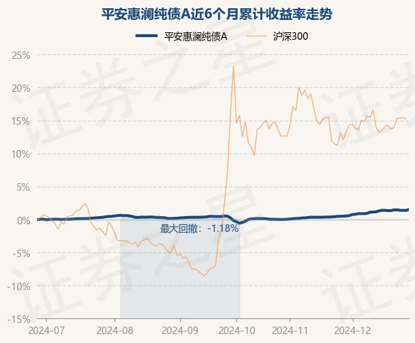 证券之星消息,12月27日,平安惠澜纯债A最新单位净值为1.1241元,累计净值为1.2091元,较前一交易日上涨0.12%。历史数据显示该基金近1个月上涨0.99%,近3个月上涨1.25%,近6个月上涨1.49%,近1年上涨4.43%。该基金近6个月的累计收益率走势如下图: