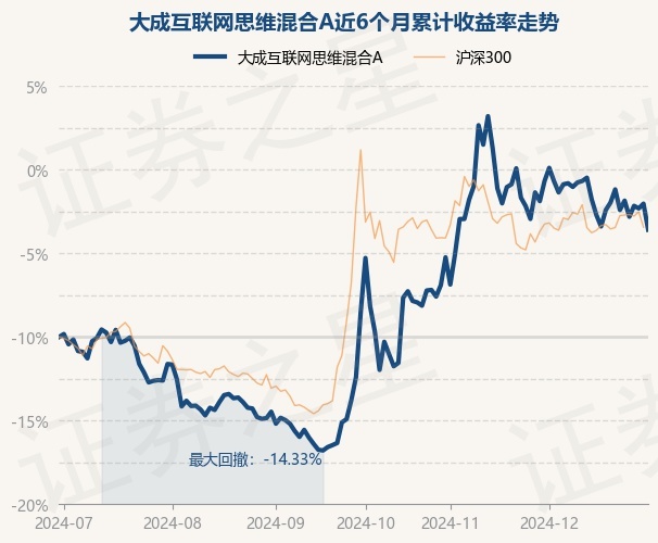 证券之星消息,12月31日,大成互联网思维混合A最新单位净值为1.7252元,累计净值为1.7252元,较前一交易日下跌2.69%。历史数据显示该基金近1个月下跌4.9%,近3个月上涨9.55%,近6个月上涨12.82%,近1年上涨10.87%。该基金近6个月的累计收益率走势如下图: