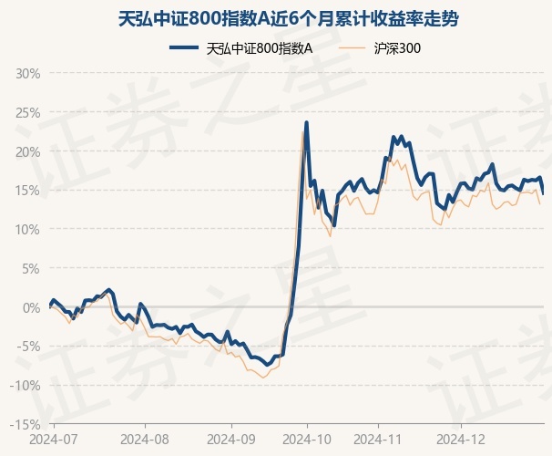 证券之星消息,12月31日,天弘中证800指数A最新单位净值为1.1951元,累计净值为1.1951元,较前一交易日下跌1.73%。历史数据显示该基金近1个月下跌0.1%,近3个月下跌2.02%,近6个月上涨14.53%,近1年上涨15.38%。该基金近6个月的累计收益率走势如下图: