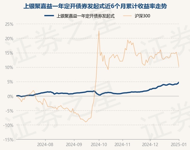 证券之星消息,1月2日,上银聚嘉益一年定开债券发起式最新单位净值为1.0658元,累计净值为1.1036元,较前一交易日上涨0.43%。历史数据显示该基金近1个月上涨2.32%,近3个月上涨4.06%,近6个月上涨4.71%,近1年上涨7.97%。该基金近6个月的累计收益率走势如下图: