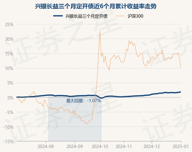 证券之星消息,1月2日,兴银长益三个月定开债最新单位净值为1.0293元,累计净值为1.3352元,较前一交易日上涨0.14%。历史数据显示该基金近1个月上涨0.81%,近3个月上涨1.79%,近6个月上涨1.86%,近1年上涨4.68%。该基金近6个月的累计收益率走势如下图: