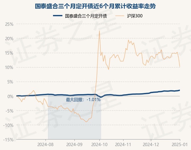 证券之星消息,1月2日,国泰盛合三个月定开债最新单位净值为1.1333元,累计净值为1.1832元,较前一交易日上涨0.1%。历史数据显示该基金近1个月上涨0.78%,近3个月上涨1.99%,近6个月上涨1.98%,近1年上涨4.62%。该基金近6个月的累计收益率走势如下图: