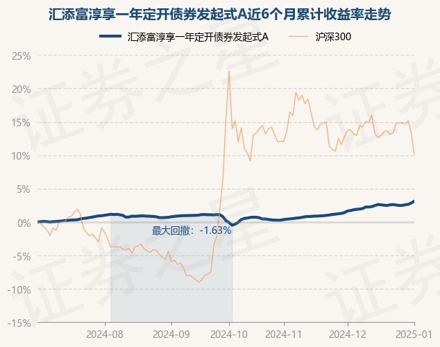 证券之星消息,1月2日,汇添富淳享一年定开债券发起式A最新单位净值为1.0442元,累计净值为1.1198元,较前一交易日上涨0.26%。历史数据显示该基金近1个月上涨1.44%,近3个月上涨2.92%,近6个月上涨3.11%,近1年上涨7.44%。该基金近6个月的累计收益率走势如下图: