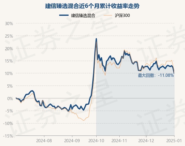 证券之星消息,1月2日,建信臻选混合最新单位净值为0.8224元,累计净值为0.8224元,较前一交易日下跌1.99%。历史数据显示该基金近1个月下跌2.32%,近3个月下跌7.08%,近6个月上涨10.05%,近1年上涨11.54%。该基金近6个月的累计收益率走势如下图: