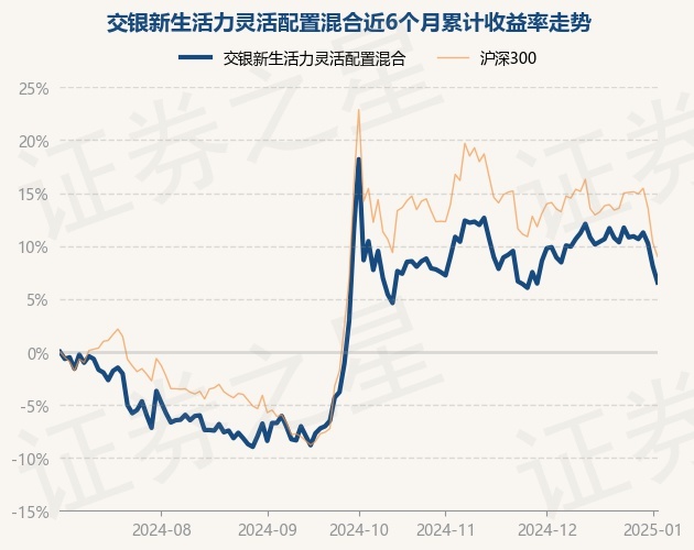 证券之星消息,1月3日,交银新生活力灵活配置混合最新单位净值为2.079元,累计净值为2.079元,较前一交易日下跌1.42%。历史数据显示该基金近1个月下跌3.03%,近3个月下跌4.55%,近6个月上涨6.56%,近1年上涨2.16%。该基金近6个月的累计收益率走势如下图:
