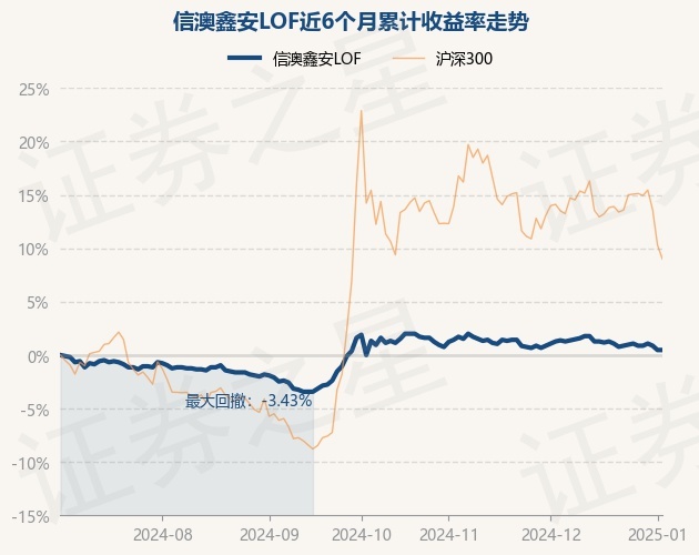 证券之星消息,1月3日,信澳鑫安LOF最新单位净值为1.004元,累计净值为1.382元,较前一交易日上涨0.0%。历史数据显示该基金近1个月下跌0.79%,近3个月下跌1.13%,近6个月上涨0.47%,近1年上涨3.62%。该基金近6个月的累计收益率走势如下图: