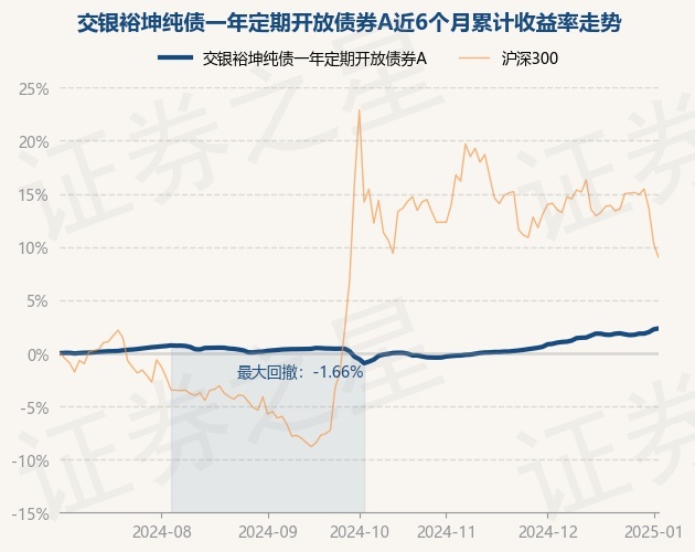 证券之星消息,1月3日,交银裕坤纯债一年定期开放债券A最新单位净值为1.0944元,累计净值为1.1804元,较前一交易日上涨0.08%。历史数据显示该基金近1个月上涨1.44%,近3个月上涨2.67%,近6个月上涨2.33%,近1年上涨5.03%。该基金近6个月的累计收益率走势如下图: