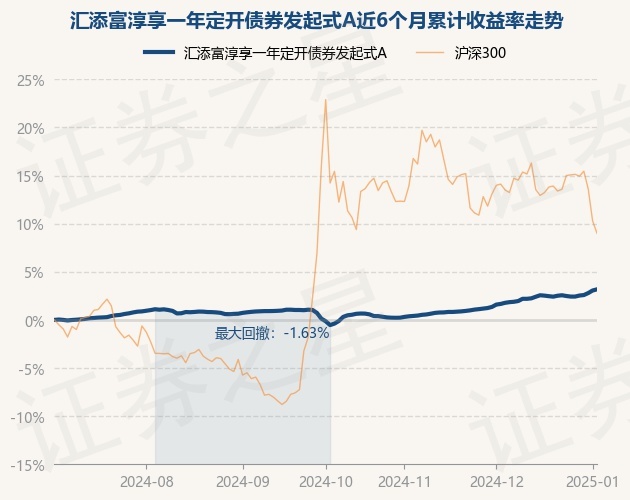 证券之星消息,1月3日,汇添富淳享一年定开债券发起式A最新单位净值为1.0454元,累计净值为1.121元,较前一交易日上涨0.11%。历史数据显示该基金近1个月上涨1.49%,近3个月上涨3.04%,近6个月上涨3.17%,近1年上涨7.59%。该基金近6个月的累计收益率走势如下图: