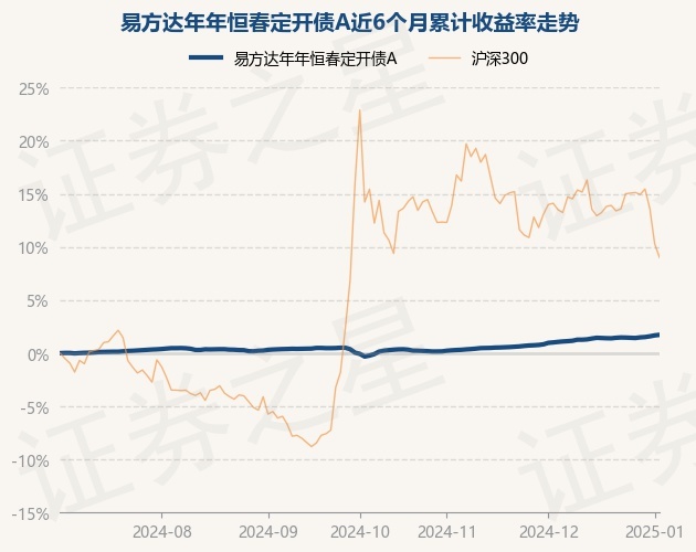 证券之星消息,1月3日,易方达年年恒春定开债A最新单位净值为1.0269元,累计净值为1.1526元,较前一交易日上涨0.05%。历史数据显示该基金近1个月上涨0.71%,近3个月上涨1.67%,近6个月上涨1.72%,近1年上涨4.37%。该基金近6个月的累计收益率走势如下图: