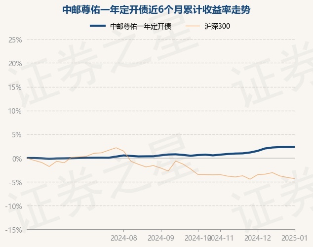 证券之星消息,1月3日,中邮尊佑一年定开债最新单位净值为1.0953元,累计净值为1.0953元,较前一交易日上涨0.0%。历史数据显示该基金近1个月上涨1.29%,近3个月上涨1.99%,近6个月上涨2.48%,近1年上涨5.17%。该基金近6个月的累计收益率走势如下图: