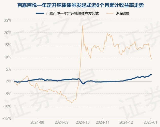 证券之星消息,1月3日,百嘉百悦一年定开纯债债券发起式最新单位净值为1.0478元,累计净值为1.0784元,较前一交易日上涨0.02%。历史数据显示该基金近1个月上涨2.19%,近3个月上涨3.18%,近6个月上涨2.71%,近1年上涨6.41%。该基金近6个月的累计收益率走势如下图: