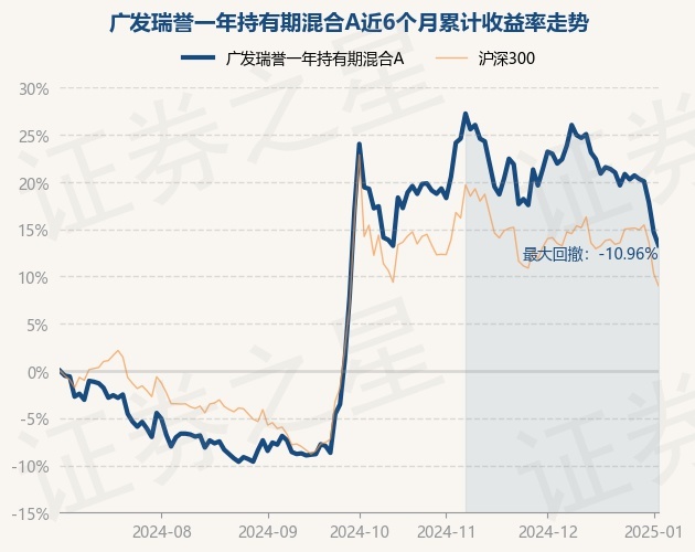证券之星消息,1月3日,广发瑞誉一年持有期混合A最新单位净值为0.9926元,累计净值为0.9926元,较前一交易日下跌1.21%。历史数据显示该基金近1个月下跌7.88%,近3个月下跌3.27%,近6个月上涨13.3%,近1年上涨8.85%。该基金近6个月的累计收益率走势如下图: