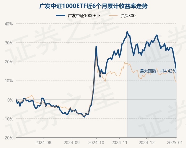 证券之星消息,1月3日,广发中证1000ETF最新单位净值为2.2884元,累计净值为0.8077元,较前一交易日下跌2.95%。历史数据显示该基金近1个月下跌10.71%,近3个月下跌1.48%,近6个月上涨16.12%,近1年下跌2.0%。该基金近6个月的累计收益率走势如下图: