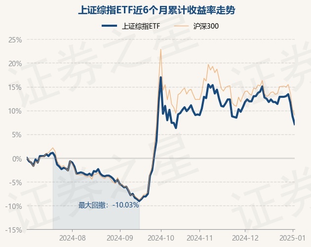 证券之星消息,1月3日,上证综指ETF最新单位净值为0.782元,累计净值为1.638元,较前一交易日下跌1.51%。历史数据显示该基金近1个月下跌4.63%,近3个月下跌4.17%,近6个月上涨7.12%,近1年上涨7.42%。该基金近6个月的累计收益率走势如下图: