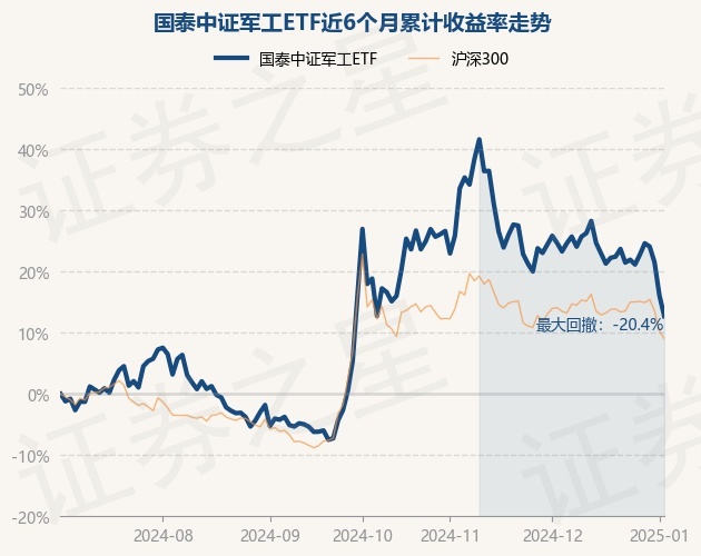 证券之星消息,1月3日,国泰中证军工ETF最新单位净值为0.9661元,累计净值为0.9661元,较前一交易日下跌2.95%。历史数据显示该基金近1个月下跌9.58%,近3个月下跌3.01%,近6个月上涨12.73%,近1年上涨1.15%。该基金近6个月的累计收益率走势如下图: