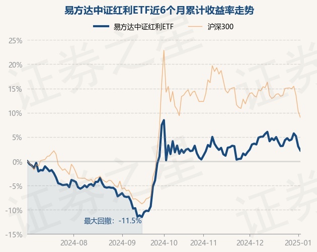 证券之星消息,1月3日,易方达中证红利ETF最新单位净值为1.3397元,累计净值为1.6107元,较前一交易日下跌0.83%。历史数据显示该基金近1个月下跌1.2%,近3个月下跌4.93%,近6个月上涨2.17%,近1年上涨12.25%。该基金近6个月的累计收益率走势如下图: