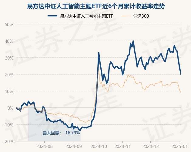 证券之星消息,1月3日,易方达中证人工智能主题ETF最新单位净值为0.8475元,累计净值为0.8475元,较前一交易日下跌2.9%。历史数据显示该基金近1个月下跌6.55%,近3个月上涨2.62%,近6个月上涨20.06%,近1年上涨18.76%。该基金近6个月的累计收益率走势如下图:
