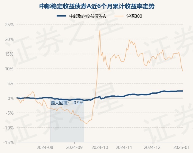证券之星消息,1月3日,中邮稳定收益债券A最新单位净值为1.138元,累计净值为1.686元,较前一交易日上涨0.0%。历史数据显示该基金近1个月上涨0.71%,近3个月上涨2.06%,近6个月上涨2.34%,近1年上涨5.37%。该基金近6个月的累计收益率走势如下图:
