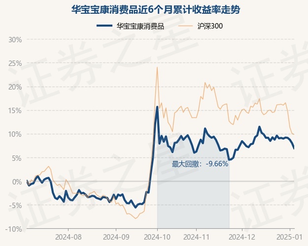 证券之星消息,1月6日,华宝宝康消费品最新单位净值为3.0094元,累计净值为8.8507元,较前一交易日下跌1.0%。历史数据显示该基金近1个月下跌0.78%,近3个月下跌4.46%,近6个月上涨6.94%,近1年下跌1.47%。该基金近6个月的累计收益率走势如下图: