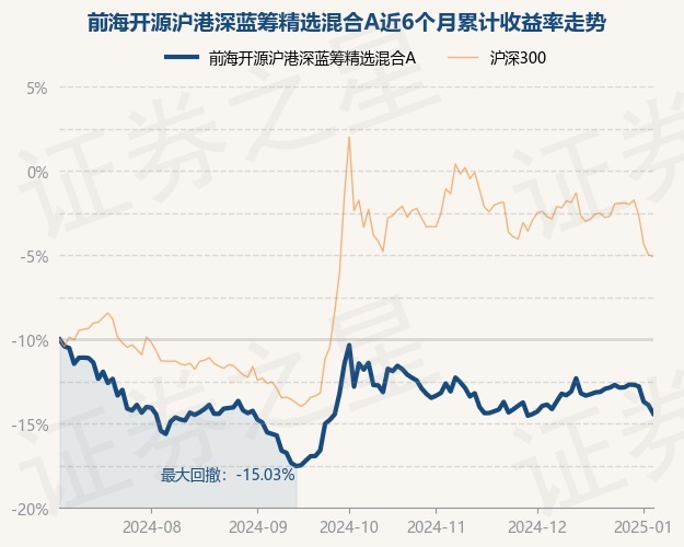 证券之星消息,1月6日,前海开源沪港深蓝筹精选混合A最新单位净值为1.0522元,累计净值为1.2132元,较前一交易日下跌1.1%。历史数据显示该基金近1个月下跌1.57%,近3个月下跌6.09%,近6个月下跌8.81%,近1年上涨6.69%。该基金近6个月的累计收益率走势如下图: