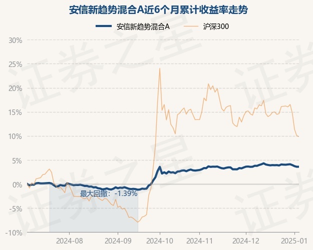 证券之星消息,1月6日,安信新趋势混合A最新单位净值为1.2461元,累计净值为1.4641元,较前一交易日上涨0.01%。历史数据显示该基金近1个月下跌0.19%,近3个月上涨0.87%,近6个月上涨3.59%,近1年上涨5.09%。该基金近6个月的累计收益率走势如下图:
