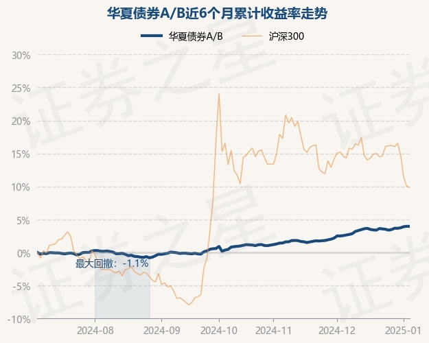 证券之星消息,1月6日,华夏债券A/B最新单位净值为1.3934元,累计净值为2.3284元,较前一交易日上涨0.0%。历史数据显示该基金近1个月上涨1.2%,近3个月上涨3.34%,近6个月上涨3.96%,近1年上涨6.43%。该基金近6个月的累计收益率走势如下图: