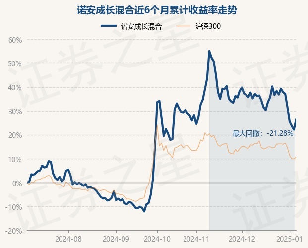 证券之星消息,1月6日,诺安成长混合最新单位净值为1.28元,累计净值为1.725元,较前一交易日下跌1.23%。历史数据显示该基金近1个月下跌11.3%,近3个月上涨5.44%,近6个月上涨22.14%,近1年上涨11.3%。该基金近6个月的累计收益率走势如下图: